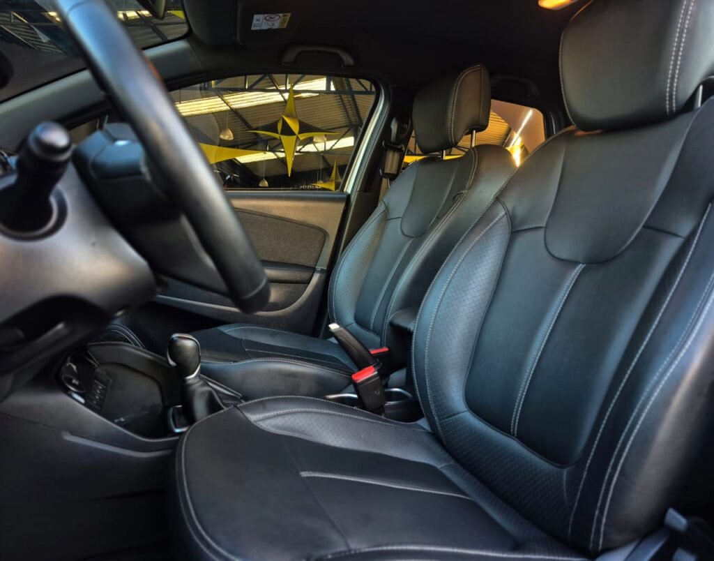 Por dentro, o espaço é excelente, com bancos confortáveis, ajuste de altura pro motorista, apoio de braço e banco traseiro bipartido e rebatível. Um SUV versátil pra qualquer necessidade.